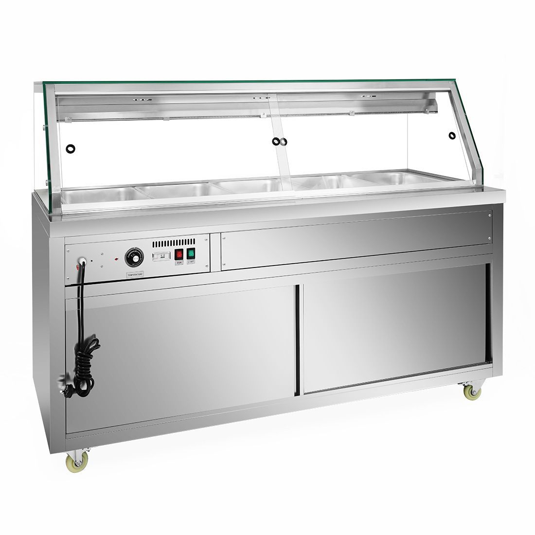 - Clear sliding doors for the serving area