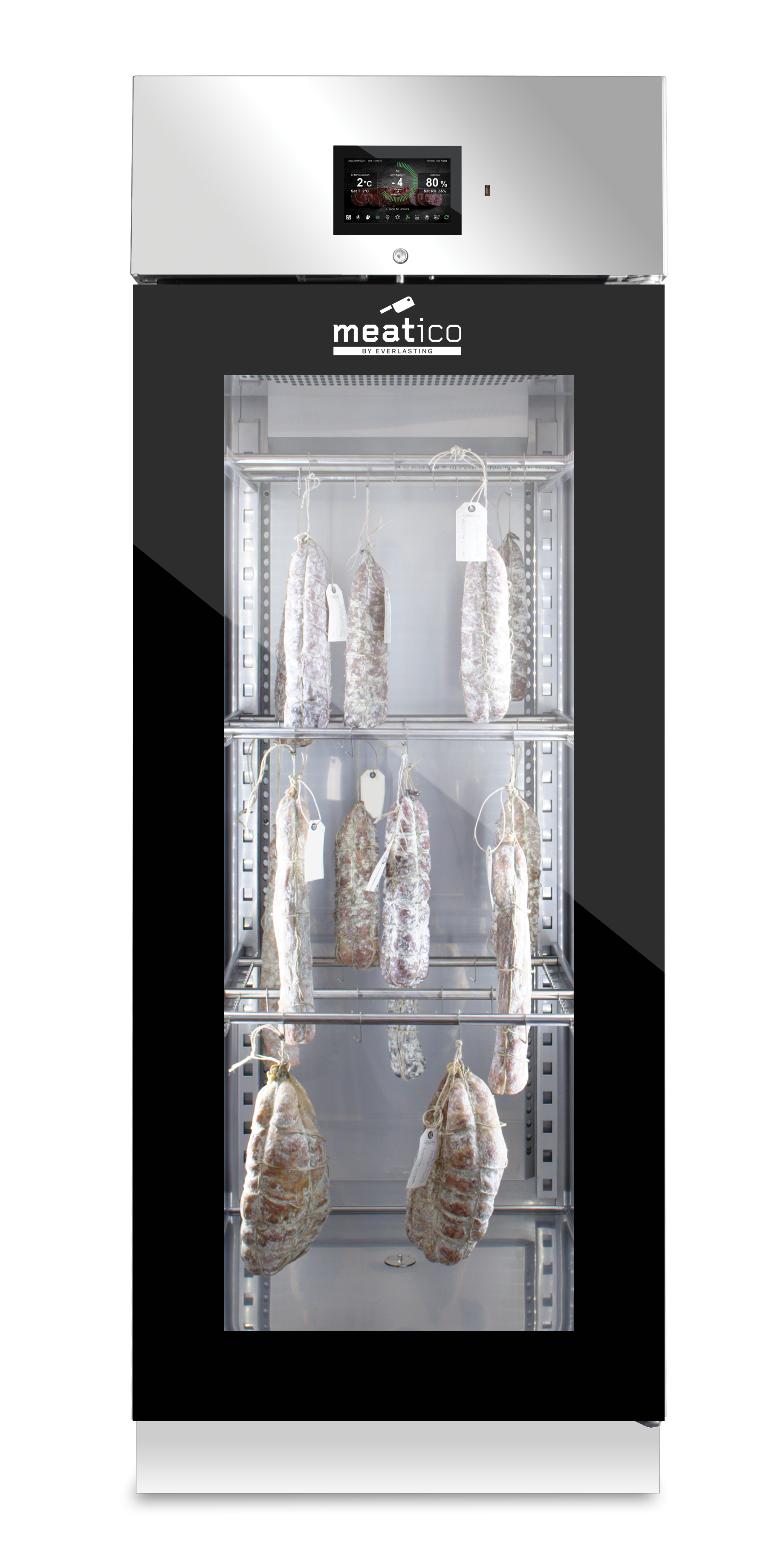 Suitable for dry ageing meat, curing salami and seasoning cheese 304 18/10 stainless steel 32¡C ambient Full control of temperature 0¡+30¡C Full control of relative humidity 40%-95% RH Approx. 100kg of hanging product Approx. 30 days for salami 75mm thick insulation Auto defrost Self closing doors Supplied with 3 shelves, 2 sets of rod grids, 3 rods per level (6 rods) and 36 hooks Built-in humidifier Must be connected to water supply. If unit is in an area with hard water, we recommend installing a water filter to protect the components Shelf guides are spaced 53mm apart Manufacture code: AC8301. The All In One Dry Age/Seasoning Cabinet by Everlasting is a must-have for catering equipment and commercial kitchen appliances solutions in commercial kitchens. This unit is perfect for restaurant operations operations, offering durability and efficiency.