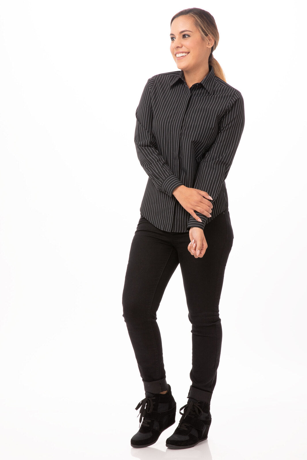 Pin down the perfect look with the Onyx Women's Dress Shirt. The pinstripe look offers a flattering and fashion-forward design while the features make it a functional workhorse. Onyx will bring out the best in you at work and play.