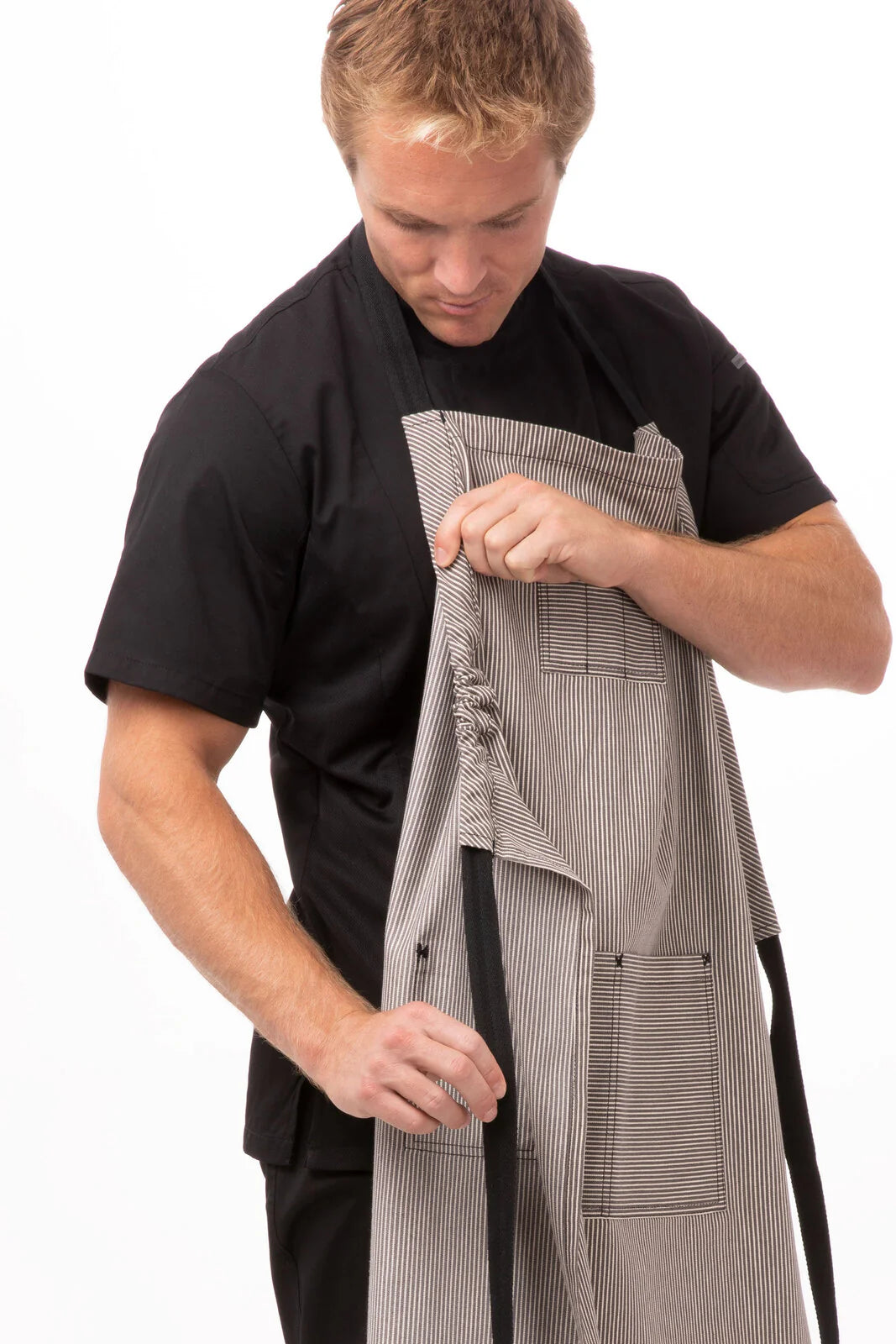 Delivering stylish and sophisticated stripes, the Portland Chef's Bib Apron springs forth with farm-to-table freshness. You say so much about yourself with the way you prepare your food. That preparation starts with looking the part. Available in black or indigo blue 83% Cotton, 17% Polyester Blend 280 g 100 cm long, 89 cm wide Adjustable contrast tape ties Criss-cross bar tacks Utility hip pocket Utility chest pocket Double front pockets Reinforced stress points