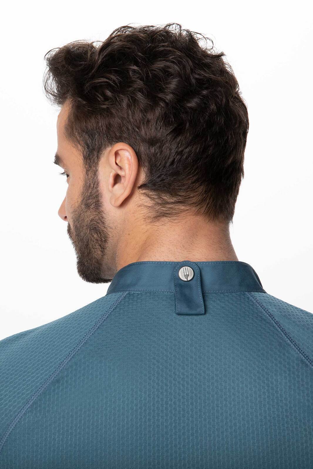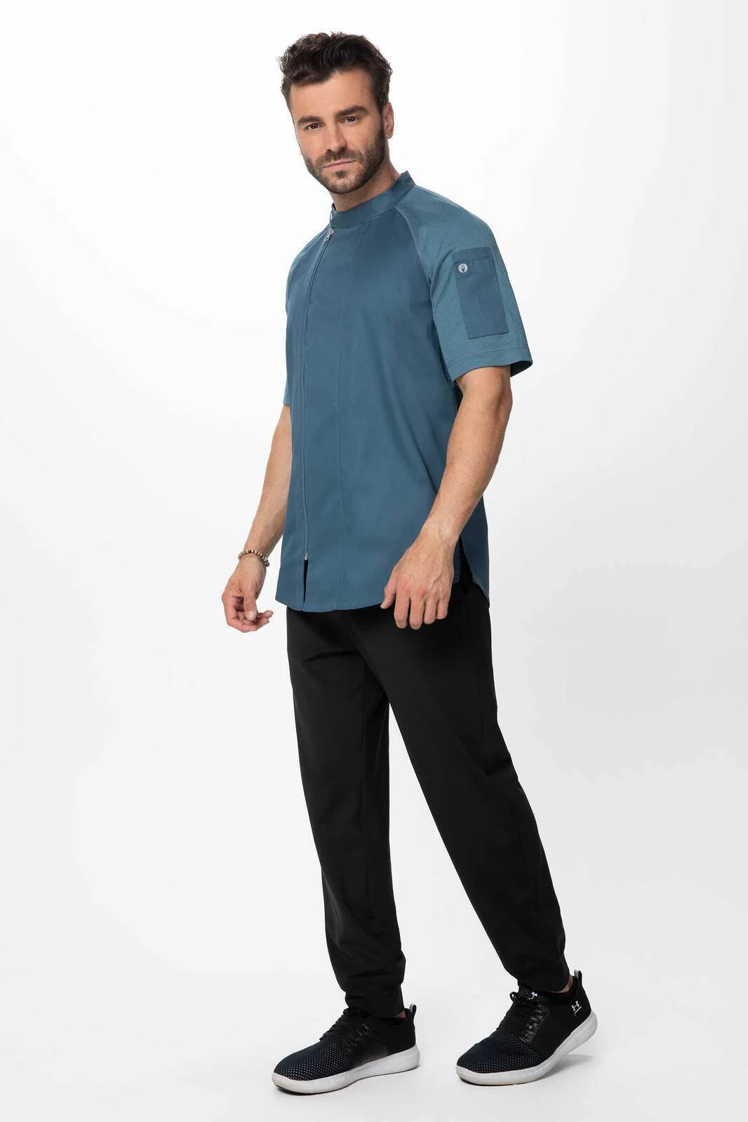 Feel revived and renewed wearing our Varkala Chef Jacket. Our raglan short-sleeve jacket features an off-set zipper front with a snap collar, a back collar apron tab to hold your apron strap in place, a left sleeve thermometer pocket, front chest concealed pockets, and side slits. Move with ease with knitted mesh sleeves and back curved yoke which are made with a recycled 4-way stretch fabric.